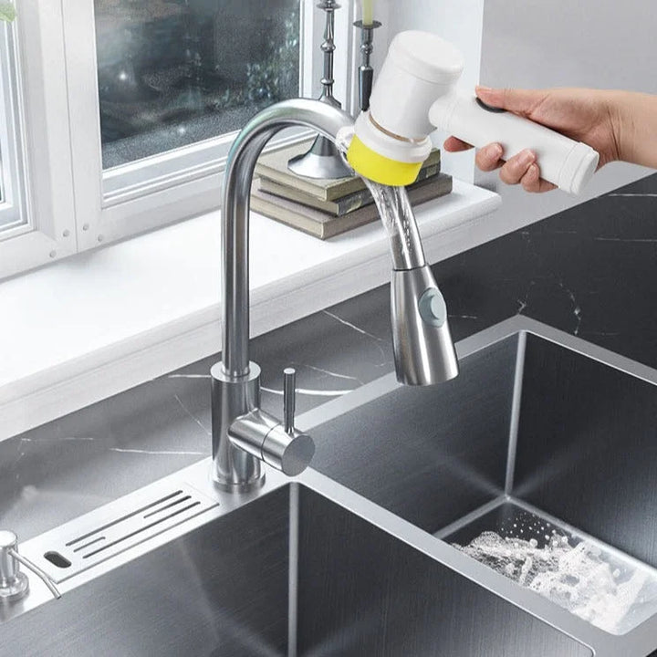 - Our Scrubber comes with FOUR BRUSH HEADS that will satisfy ALL your cleaning needs. Choose the appropriate brush head based on the desired cleaning area to get rid of any stubborn stains and dirty surfaces. We recommend keeping an extra set of brush heads to separate kitchen and bathroom cleaning or indoor and outdoor uses.